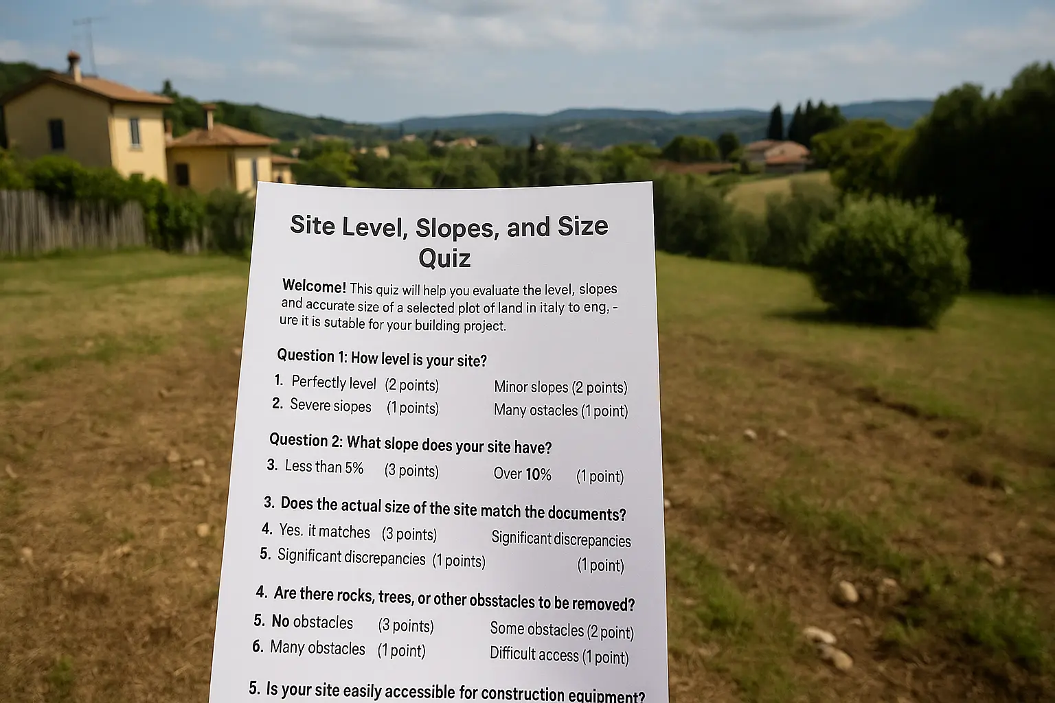 This article presents a concise quiz designed to help you evaluate the flatness, slopes, real size, obstacles, and accessibility of a plot in Italy, providing a quick assessment of its suitability for construction and guidance on necessary preparatory measures.