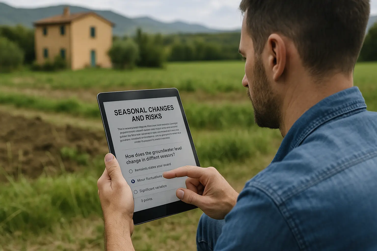 This interactive test helps you evaluate seasonal changes and potential environmental risks on a land plot in Italy, providing a structured way to assess groundwater levels, flooding, lighting, weather conditions, and vegetation to make an informed decision before building.